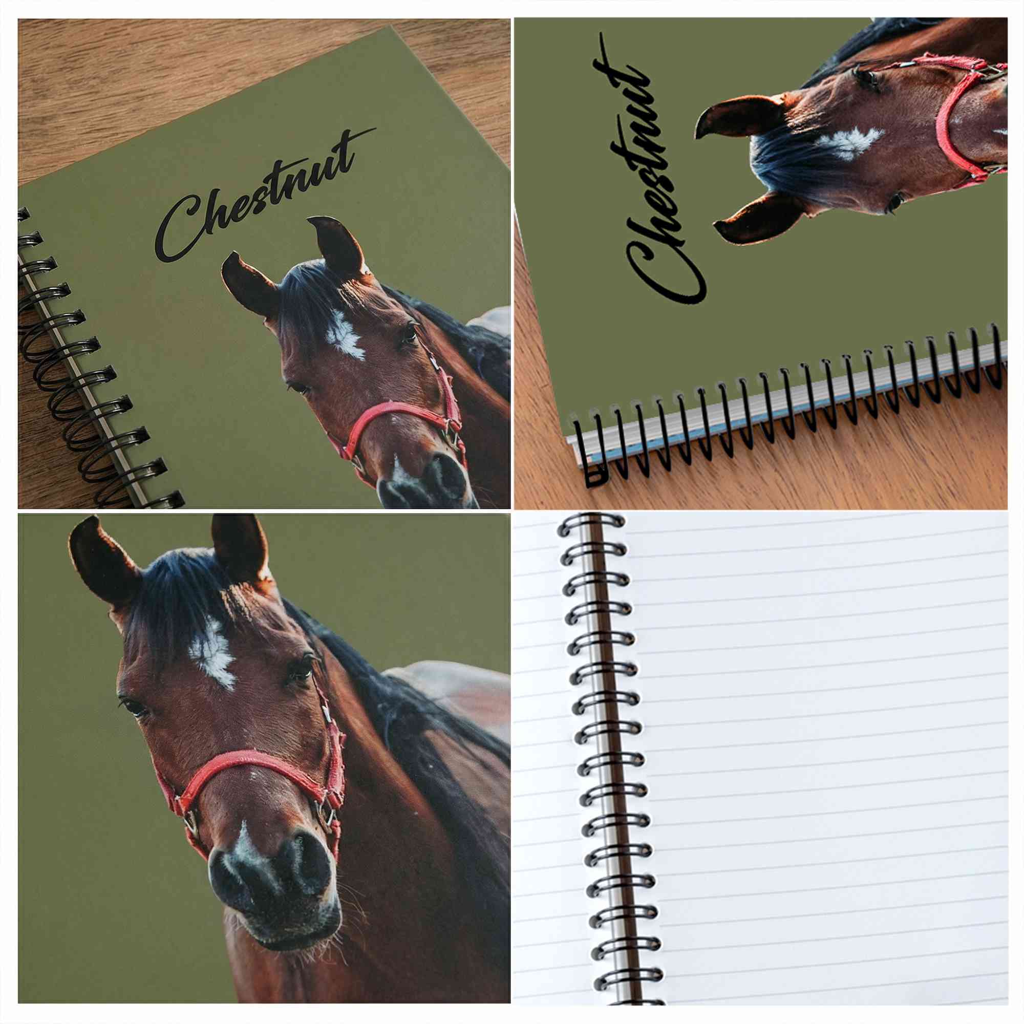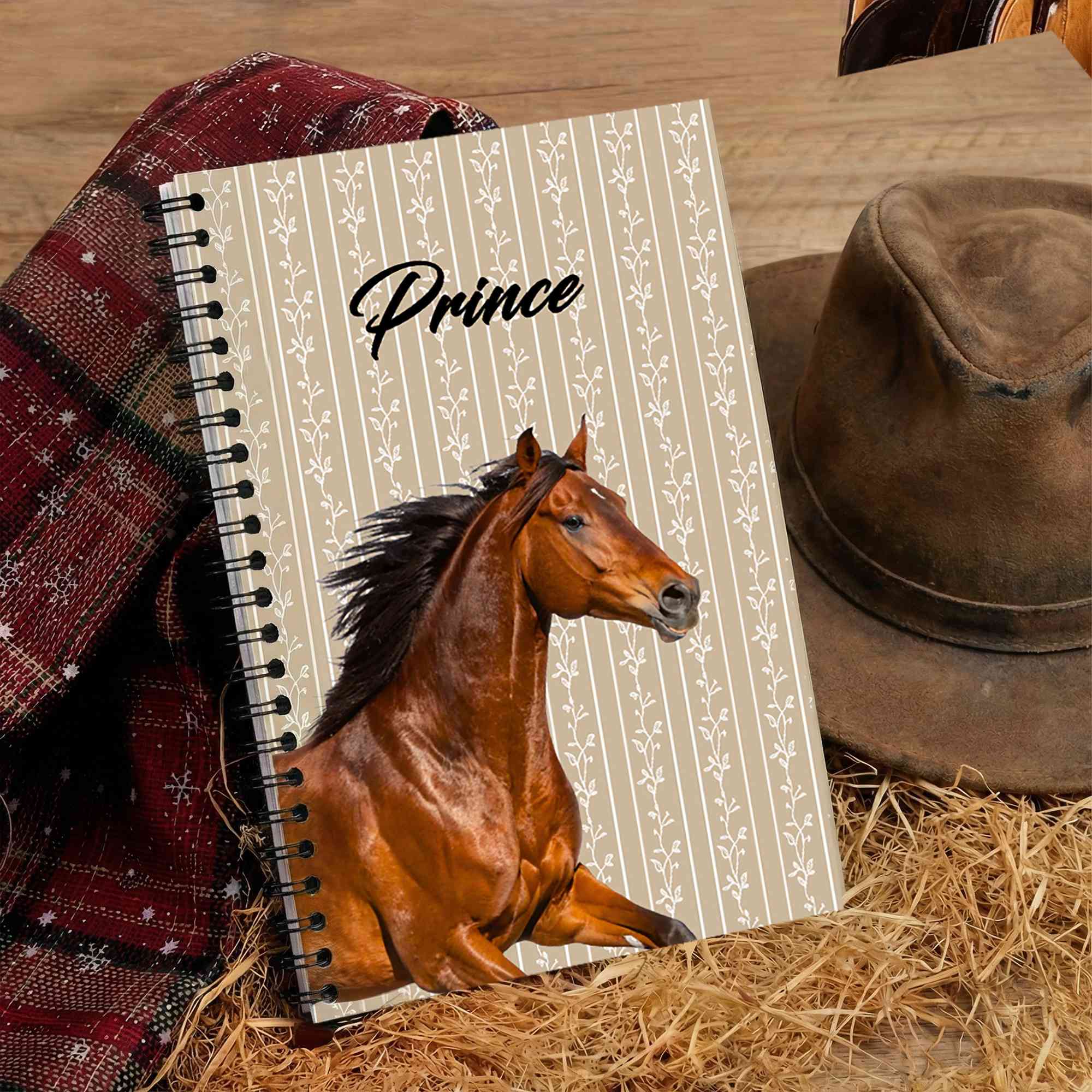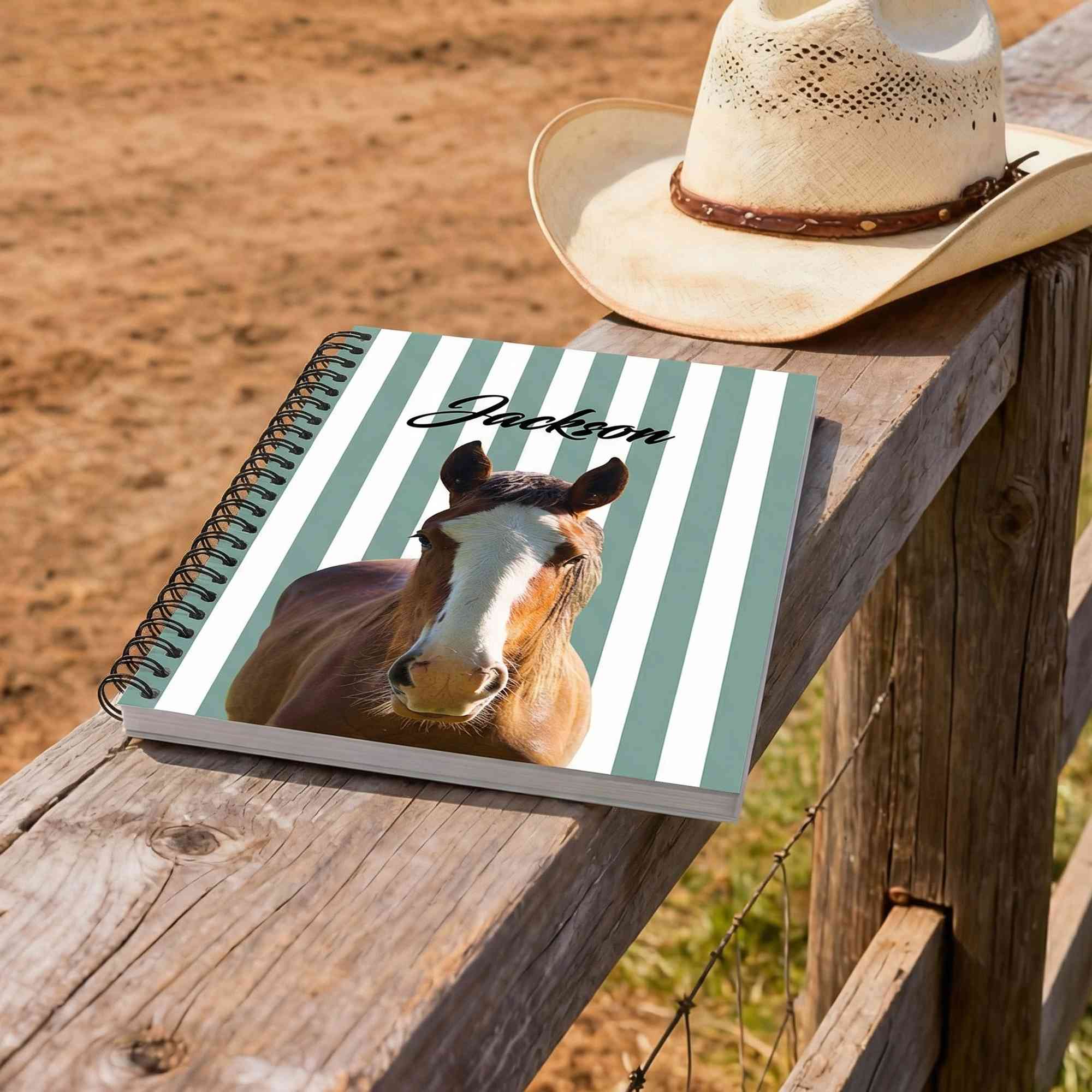 Custom Horse Portrait Design - Inspired by the elegance and strength of horses, this notebook features a creative equine portrait style. It combines realistic horse artwork with personalized name customization to emphasize a meaningful bond. Optional background designs such as stripes or horseshoe motifs let you match your personal style, turning simple stationery into a cherished keepsake.