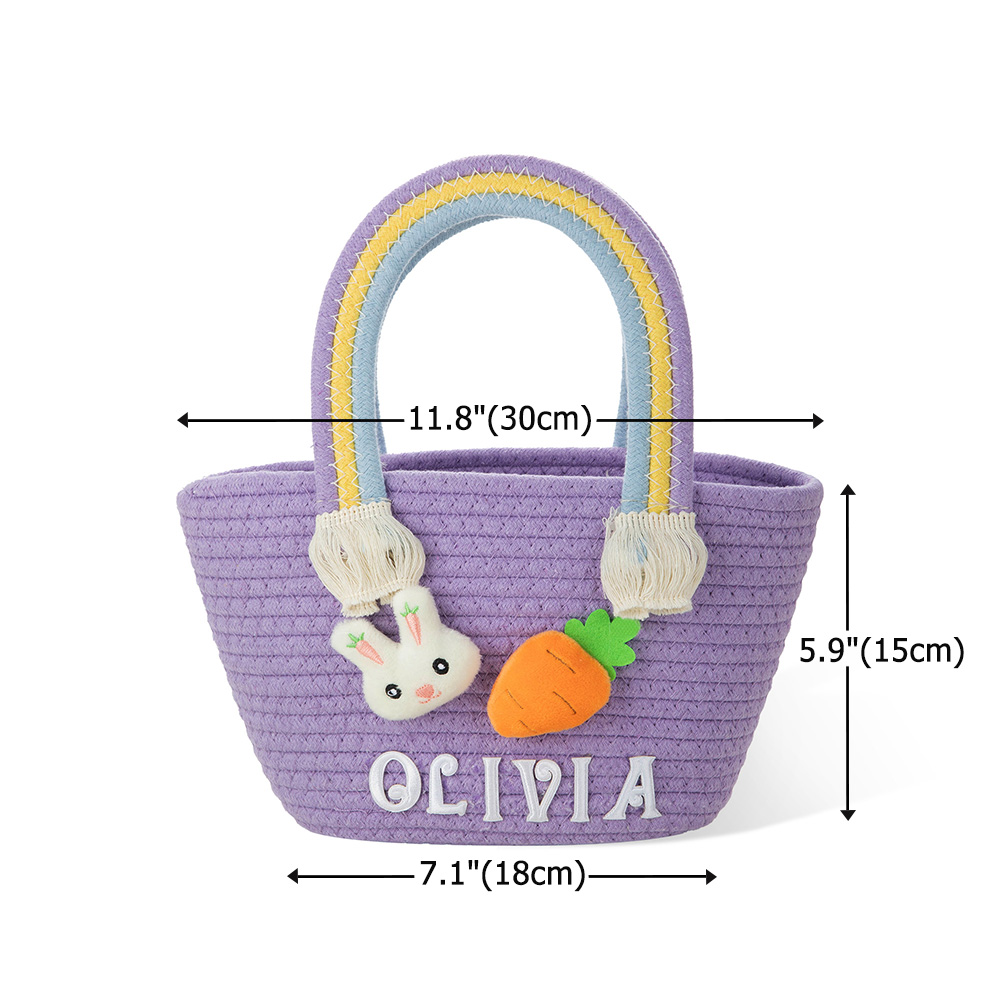 Bunny & Carrot Design - This personalized Easter basket features a charming bunny and carrot theme, bringing a playful touch to Easter celebrations. Its colorful rainbow handle adds a cheerful accent, perfect for kids during egg hunts or festive displays.